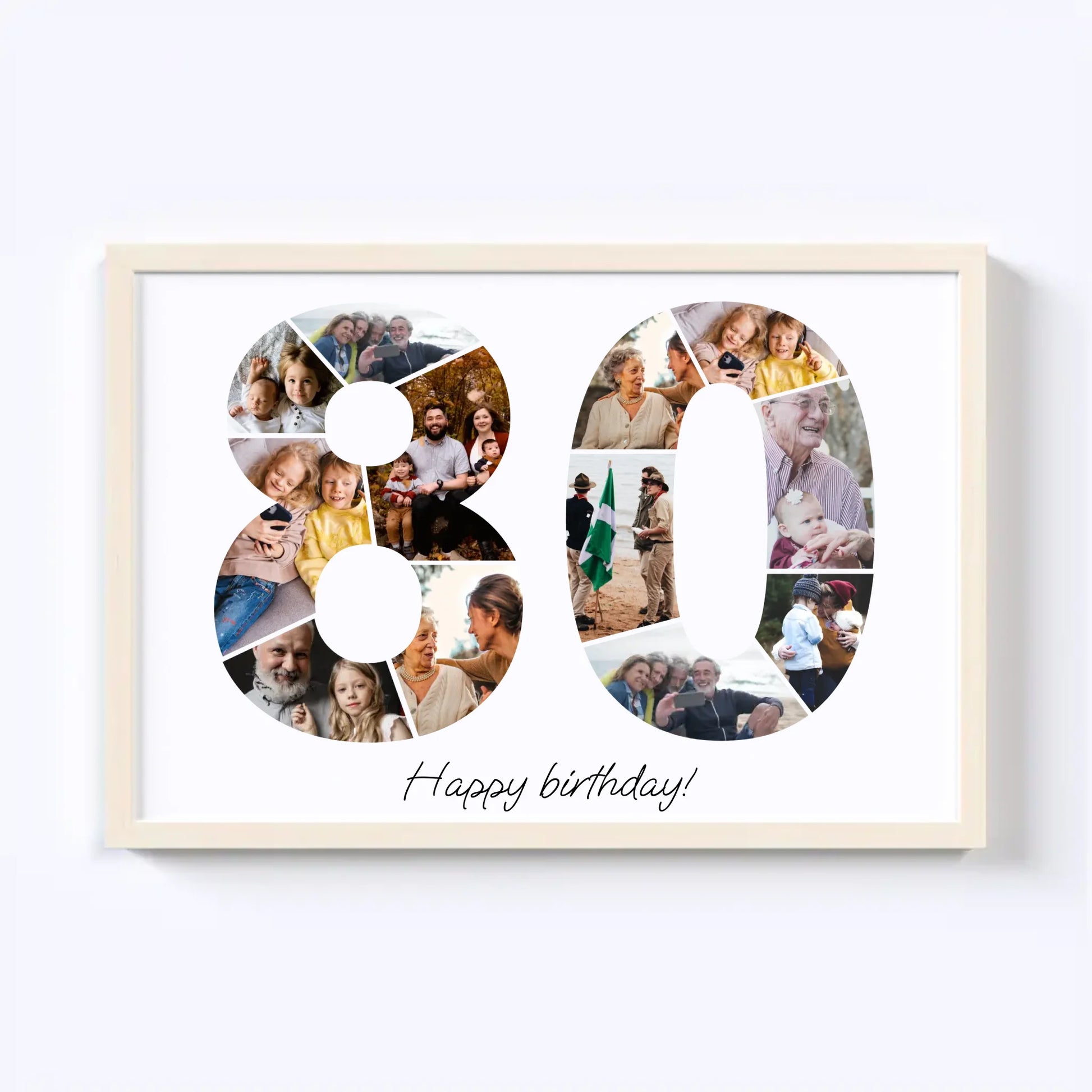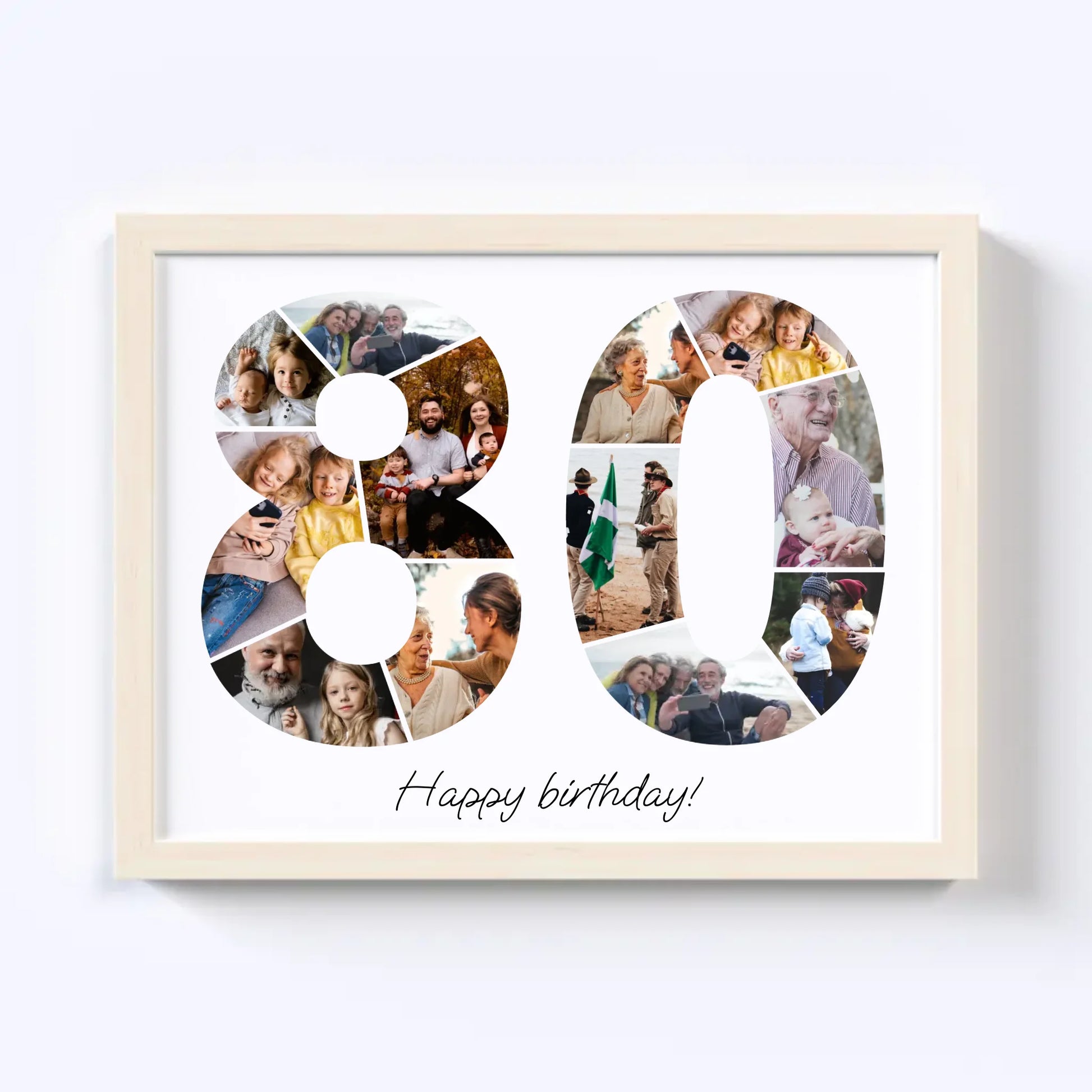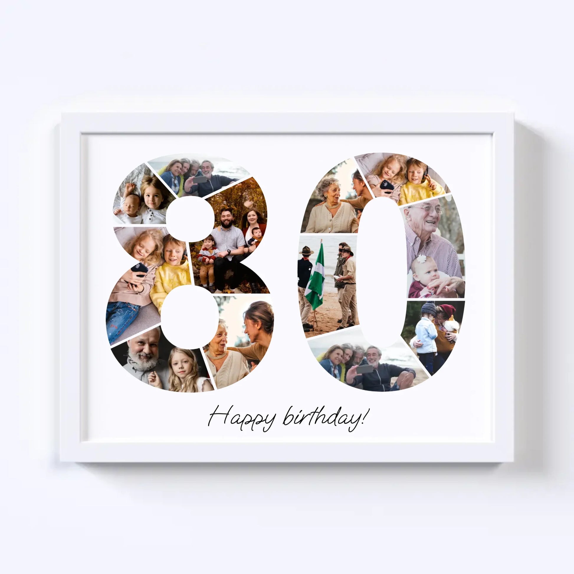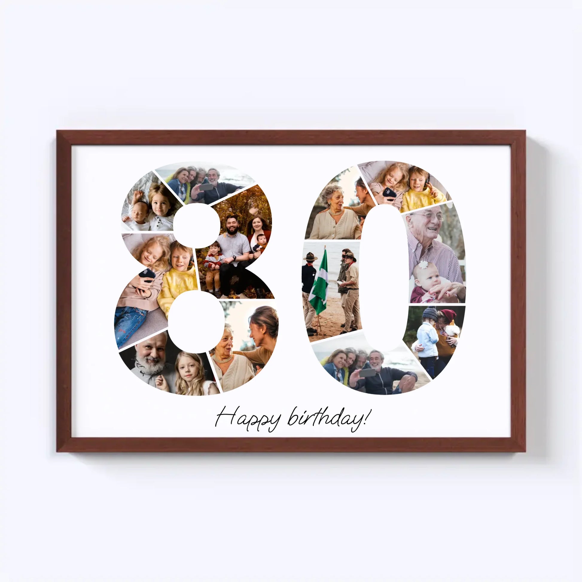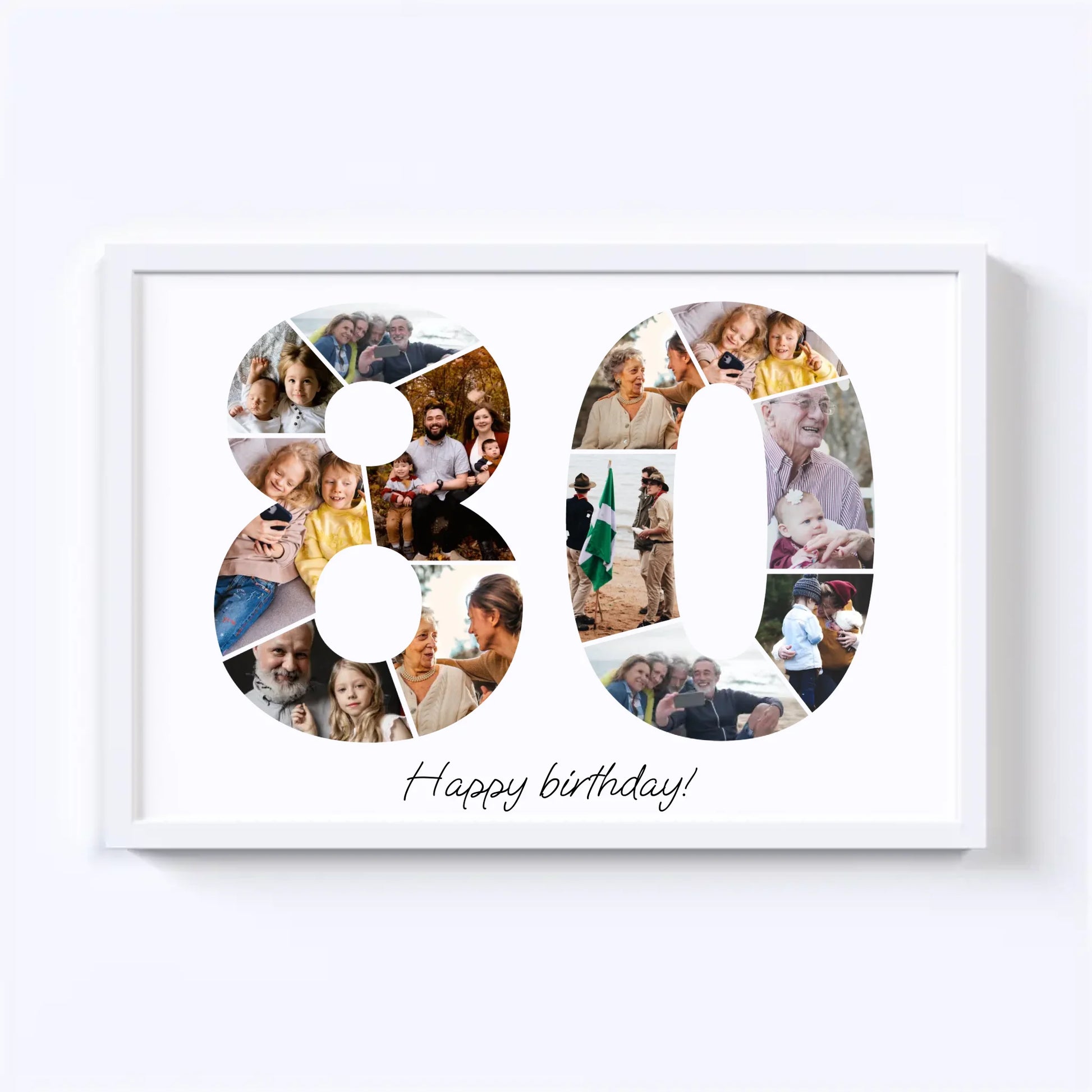 Vier een opmerkelijk leven met onze aangepaste nummerfotocollage voor verjaardagen van 80 tot 89! Dit gepersonaliseerde ontwerp bevat uw favoriete foto's prachtig gerangschikt binnen de nummers van het verjaardagsjaar, wat tientallen jaren aan gekoesterde herinneringen laat zien. Of het nu een 80e, 85e of ergens daartussenin is, deze collage is een perfect cadeau of aandenken om hun mijlpaalverjaardag te eren. Creëer een blijvend eerbetoon aan een leven vol liefde, gelach en onvergetelijke momenten!