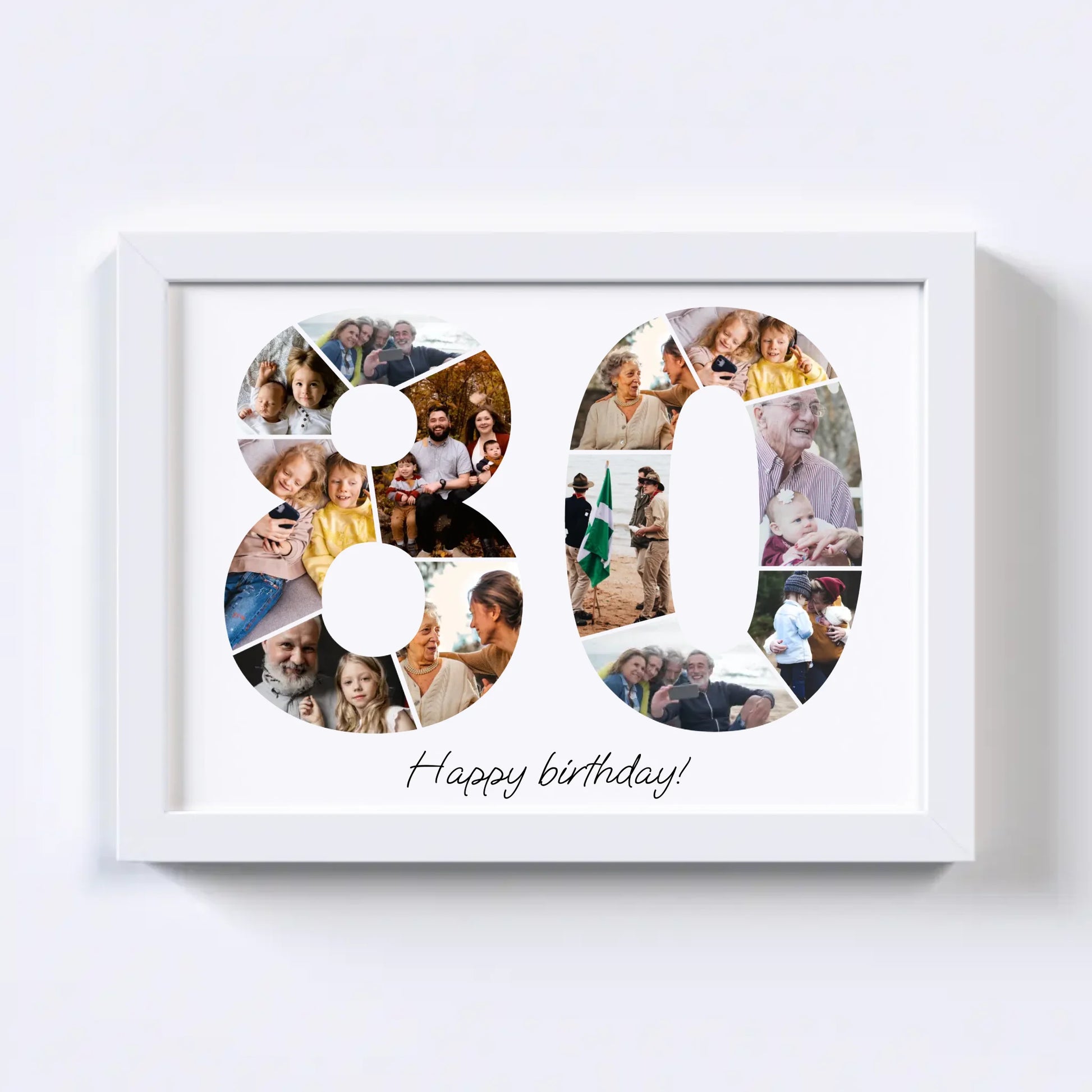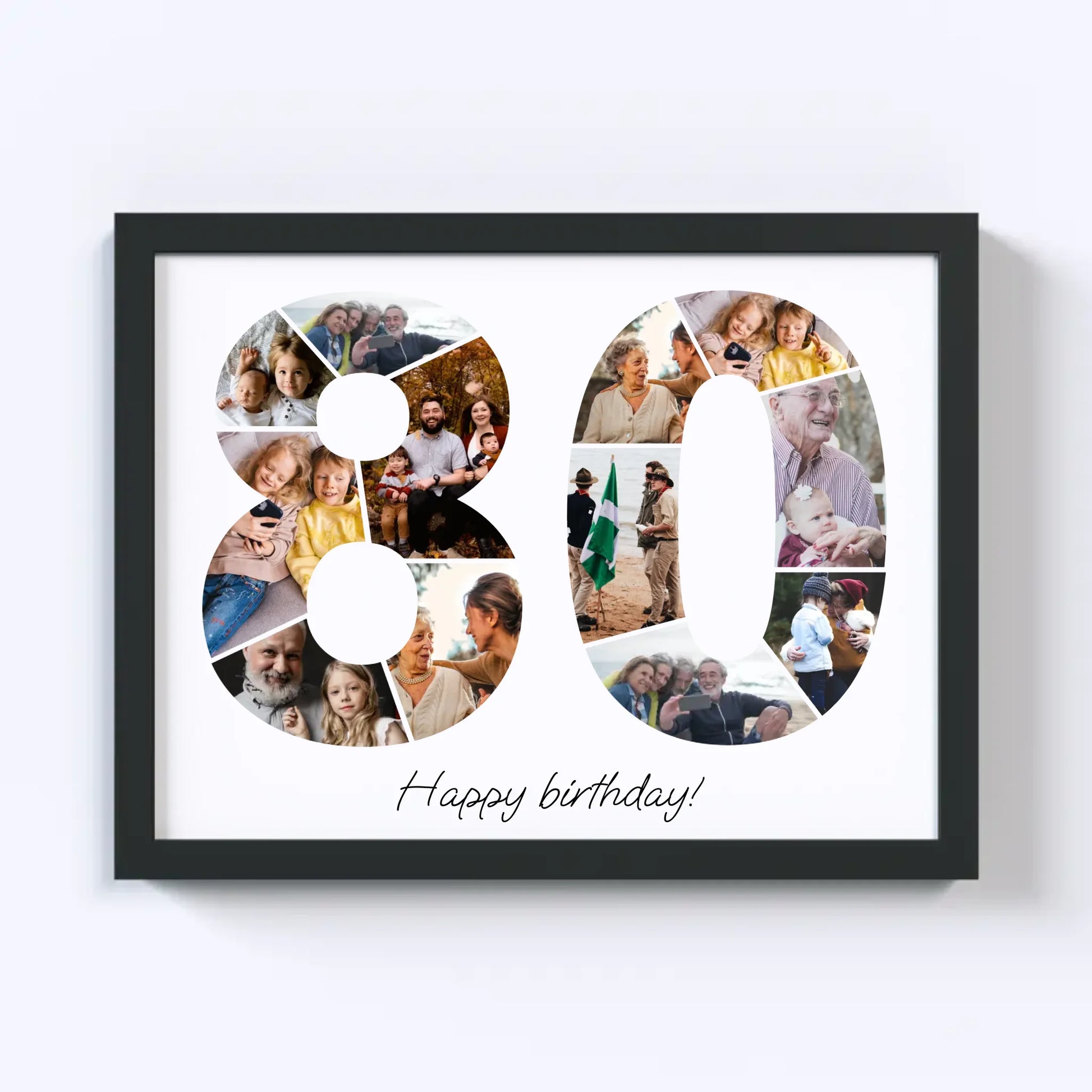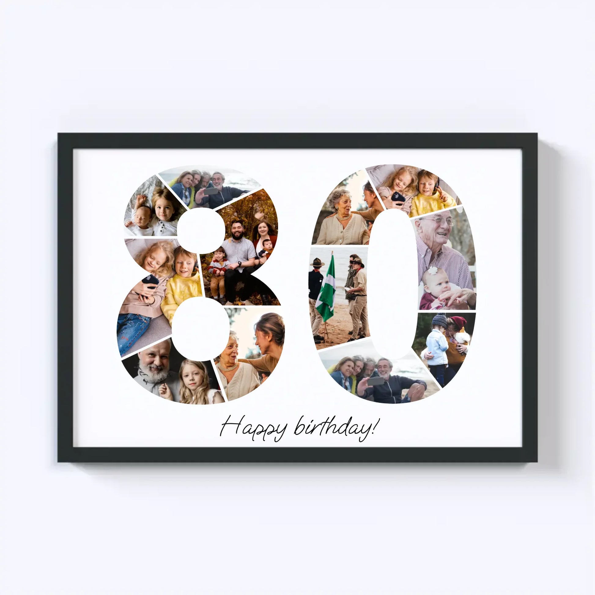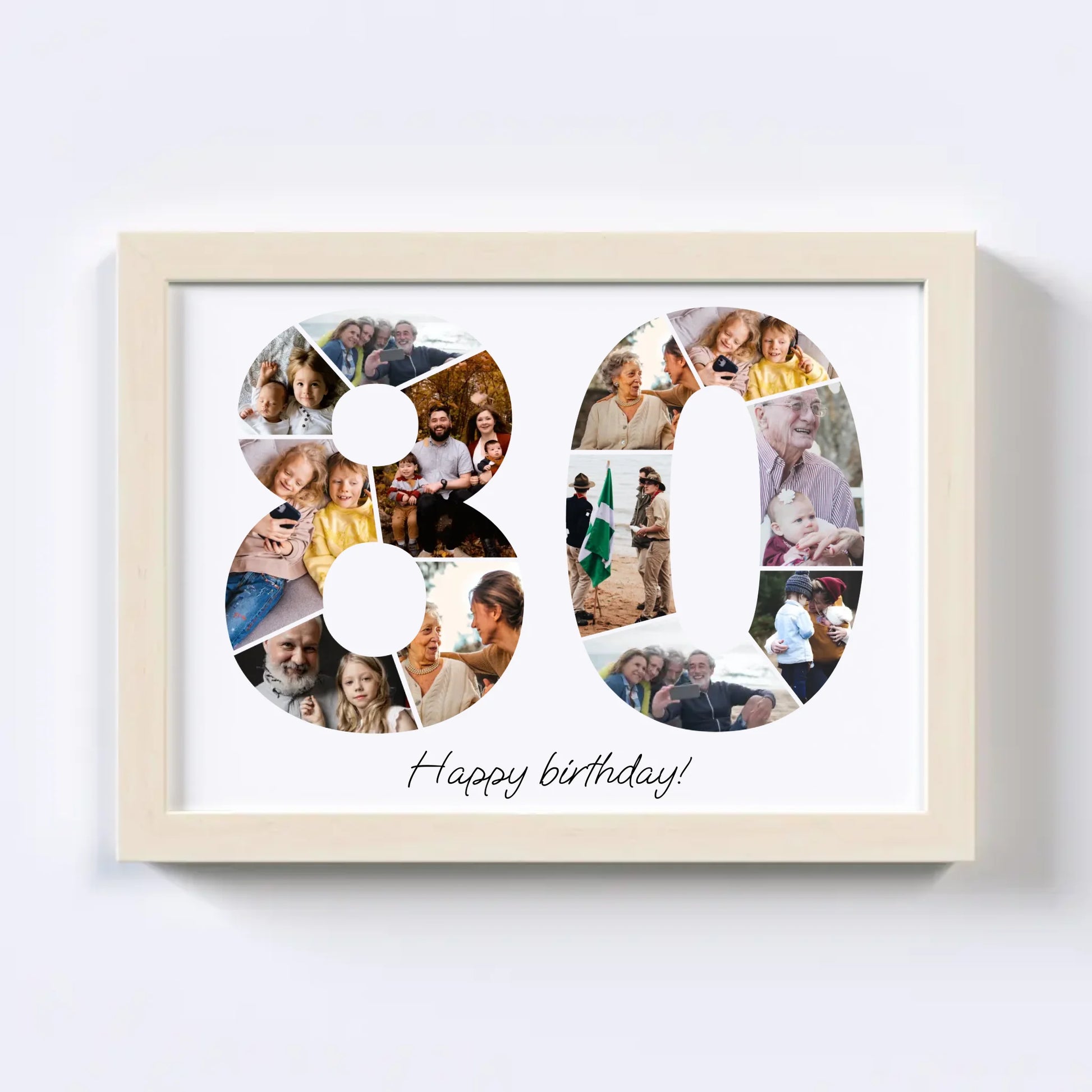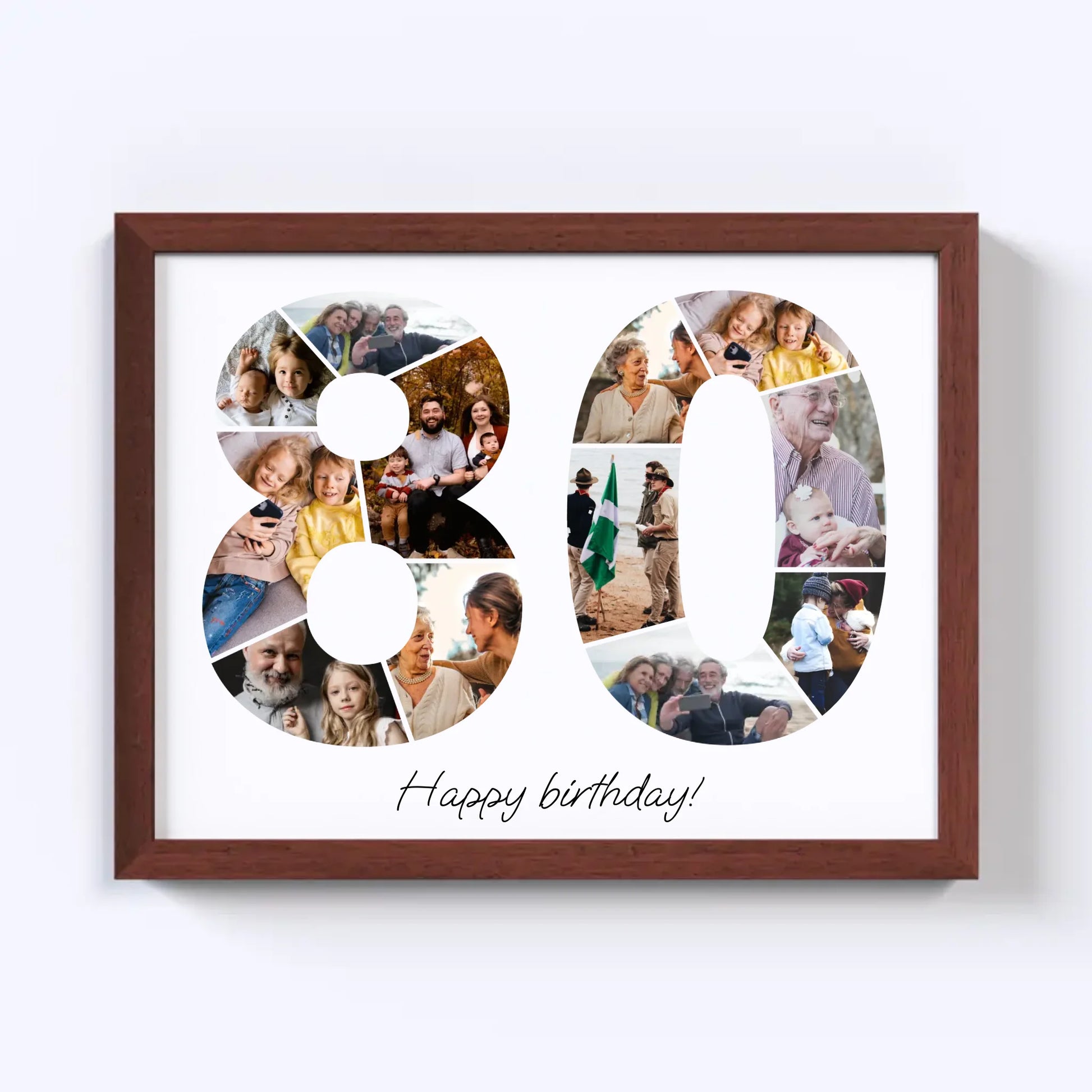 Vier een opmerkelijk leven met onze aangepaste nummerfotocollage voor verjaardagen van 80 tot 89! Dit gepersonaliseerde ontwerp bevat uw favoriete foto's prachtig gerangschikt binnen de nummers van het verjaardagsjaar, wat tientallen jaren aan gekoesterde herinneringen laat zien. Of het nu een 80e, 85e of ergens daartussenin is, deze collage is een perfect cadeau of aandenken om hun mijlpaalverjaardag te eren. Creëer een blijvend eerbetoon aan een leven vol liefde, gelach en onvergetelijke momenten!