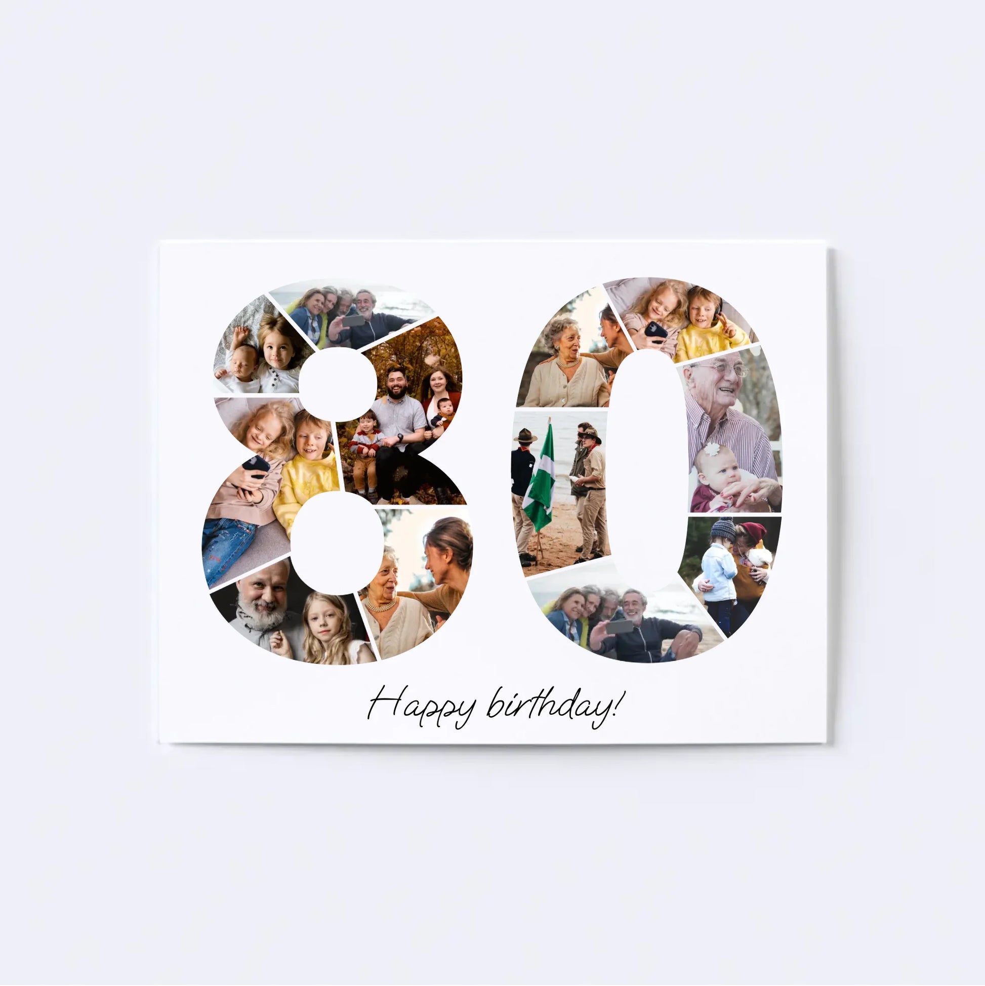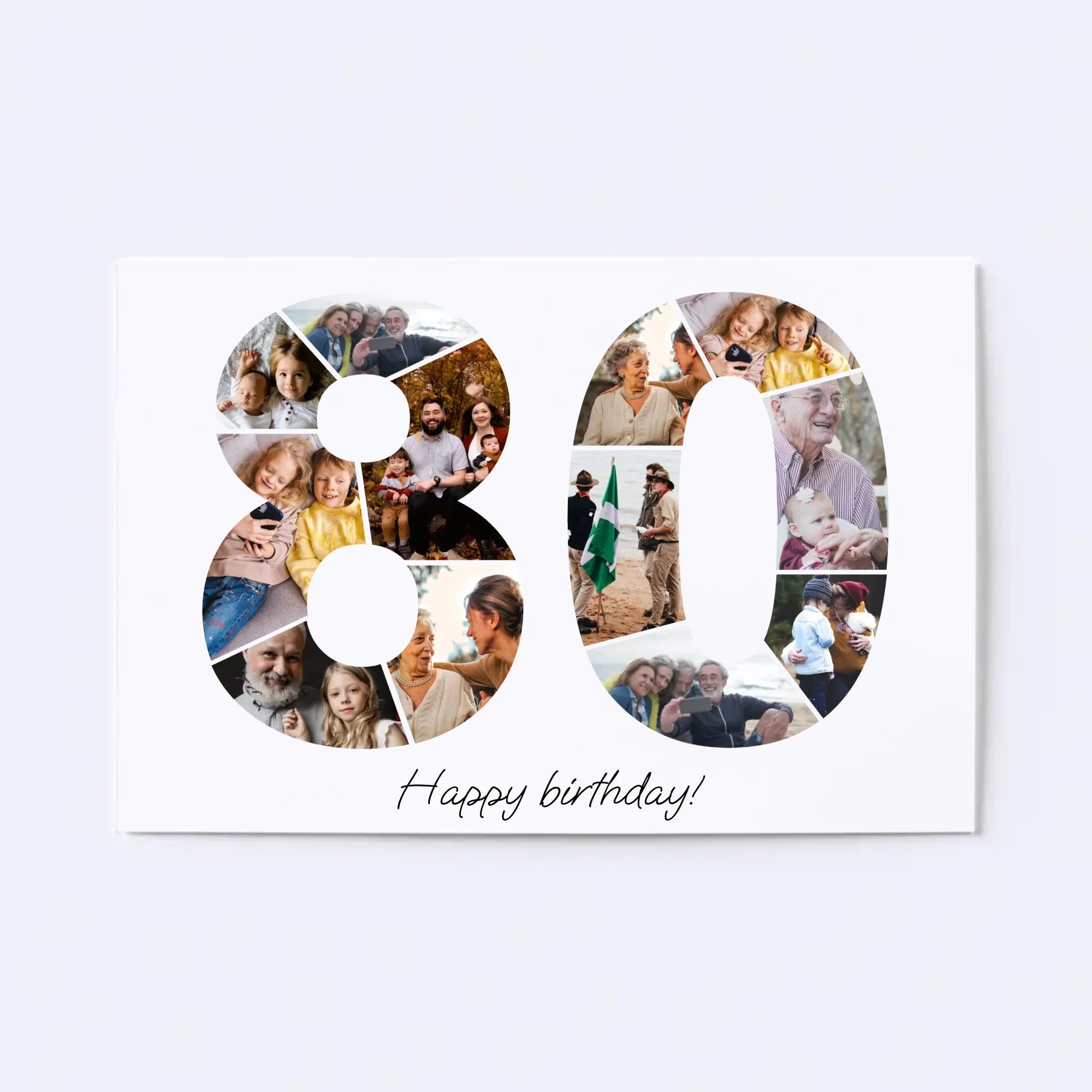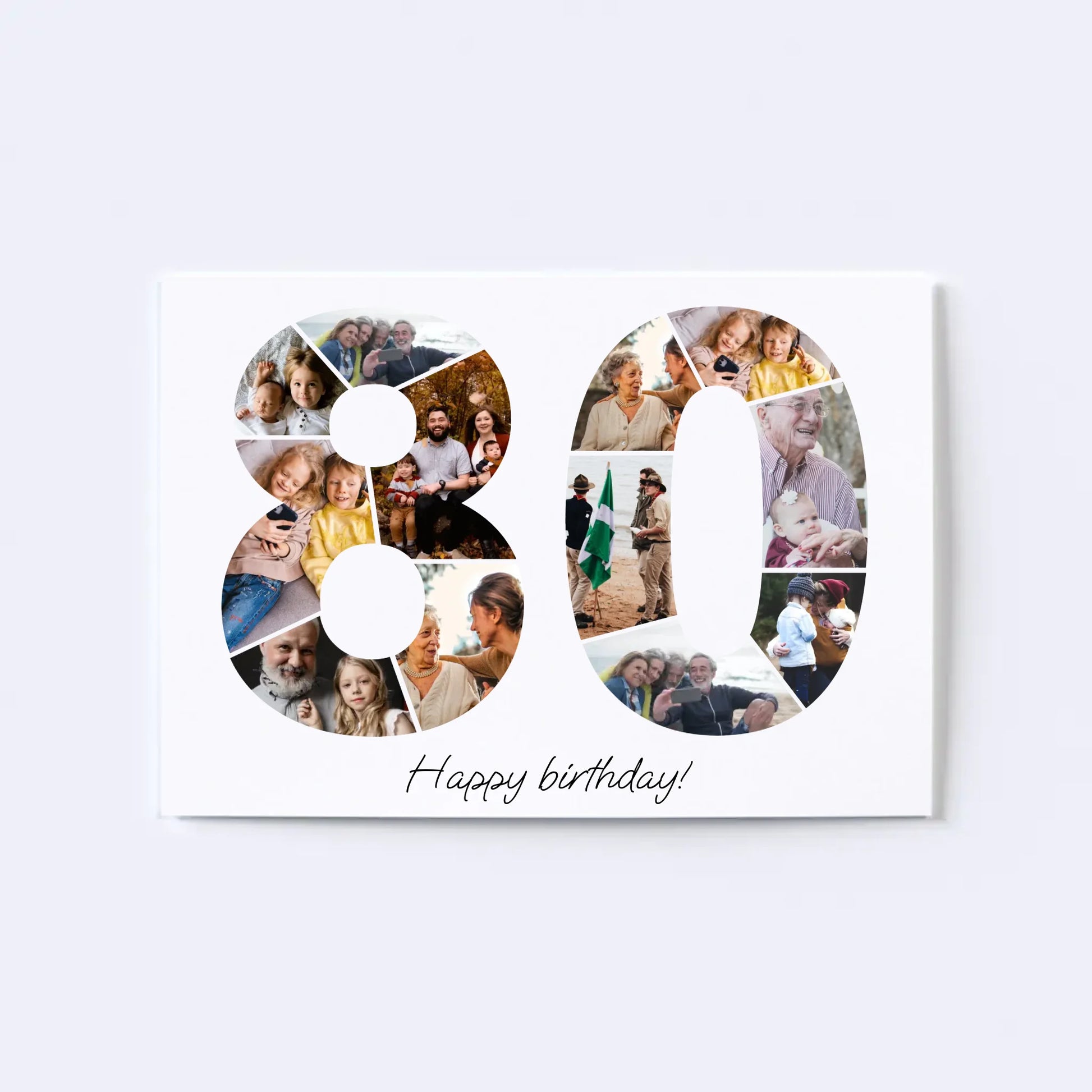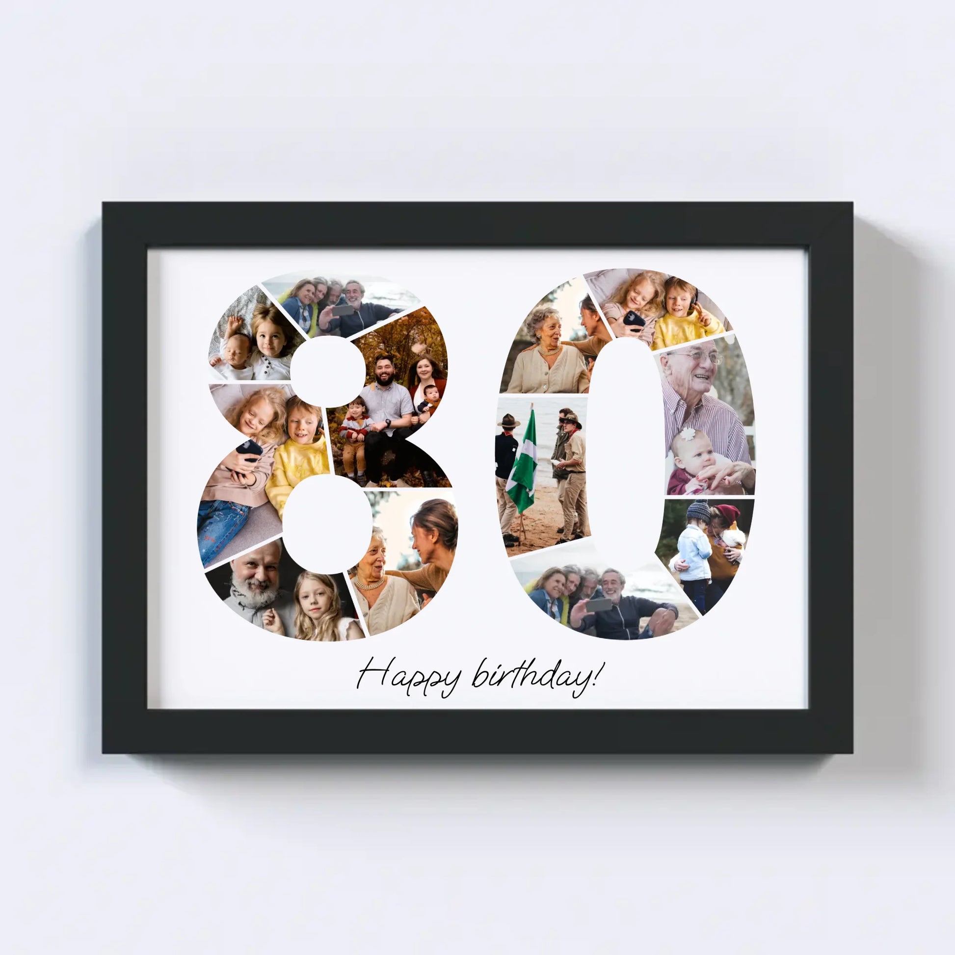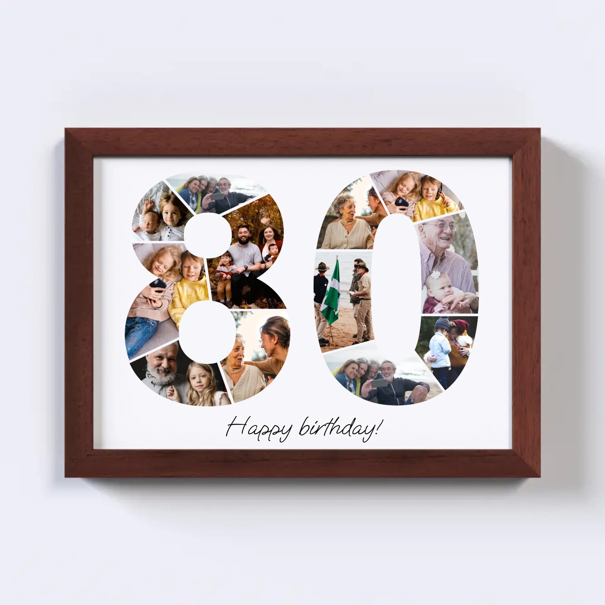 Vier een opmerkelijk leven met onze aangepaste nummerfotocollage voor verjaardagen van 80 tot 89! Dit gepersonaliseerde ontwerp bevat uw favoriete foto's prachtig gerangschikt binnen de nummers van het verjaardagsjaar, wat tientallen jaren aan gekoesterde herinneringen laat zien. Of het nu een 80e, 85e of ergens daartussenin is, deze collage is een perfect cadeau of aandenken om hun mijlpaalverjaardag te eren. Creëer een blijvend eerbetoon aan een leven vol liefde, gelach en onvergetelijke momenten!