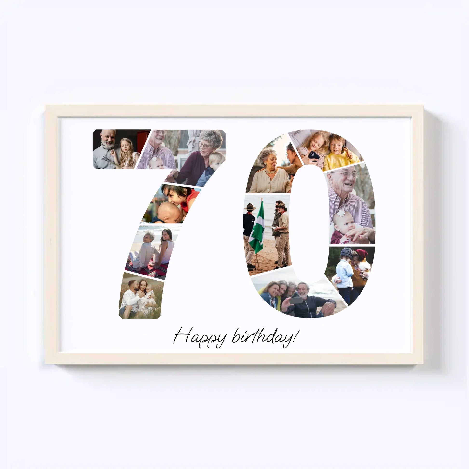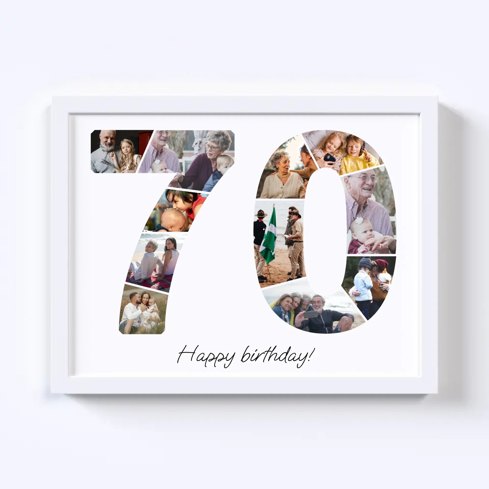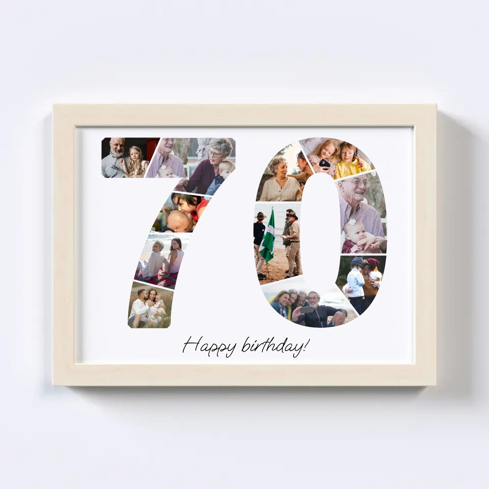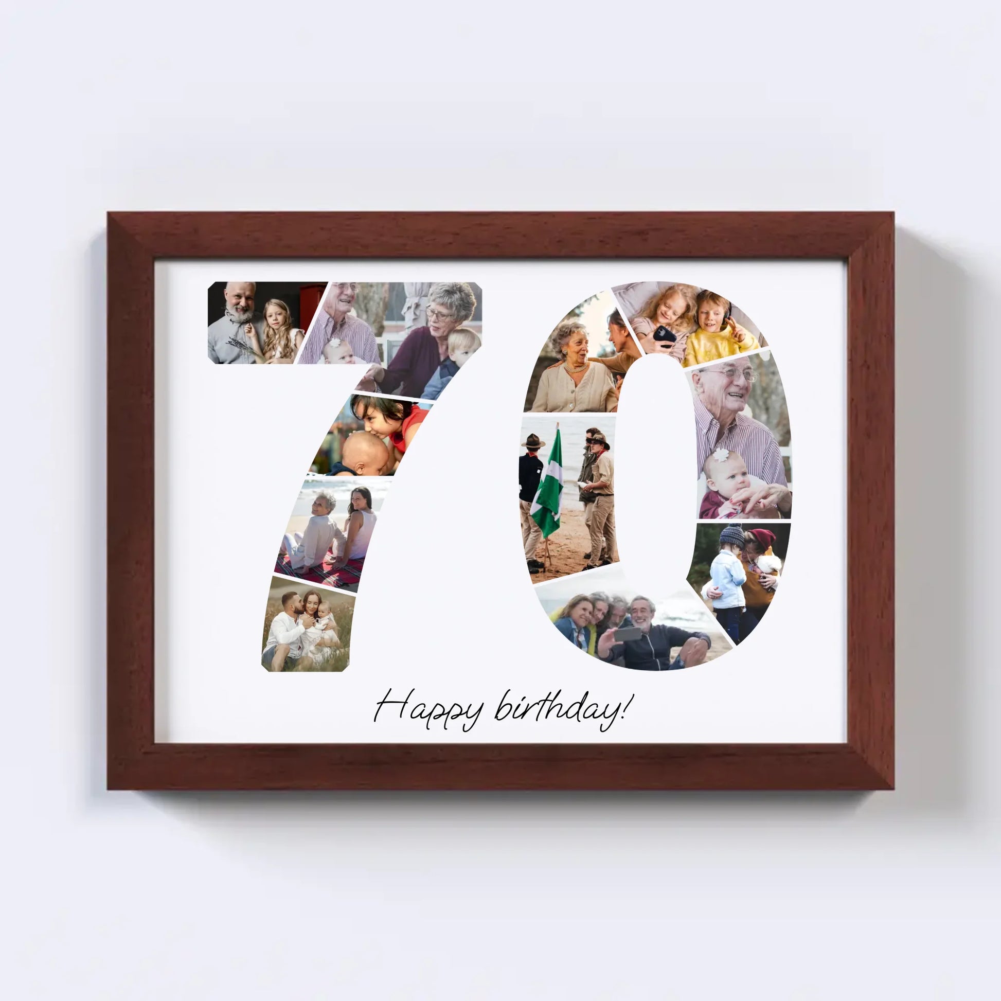 Vier zeven decennia aan herinneringen met onze aangepaste nummerfotocollage voor verjaardagen van 70 tot 79! Dit gepersonaliseerde ontwerp rangschikt uw favoriete foto's binnen de nummers van het verjaardagsjaar, en legt de speciale momenten van een leven vast. Perfect voor een 70e, 75e of elke mijlpaal daartussenin, deze collage is een oprecht cadeau of aandenken dat hun ongelooflijke reis eert. Verander gekoesterde herinneringen in een prachtig eerbetoon voor hun grote viering!