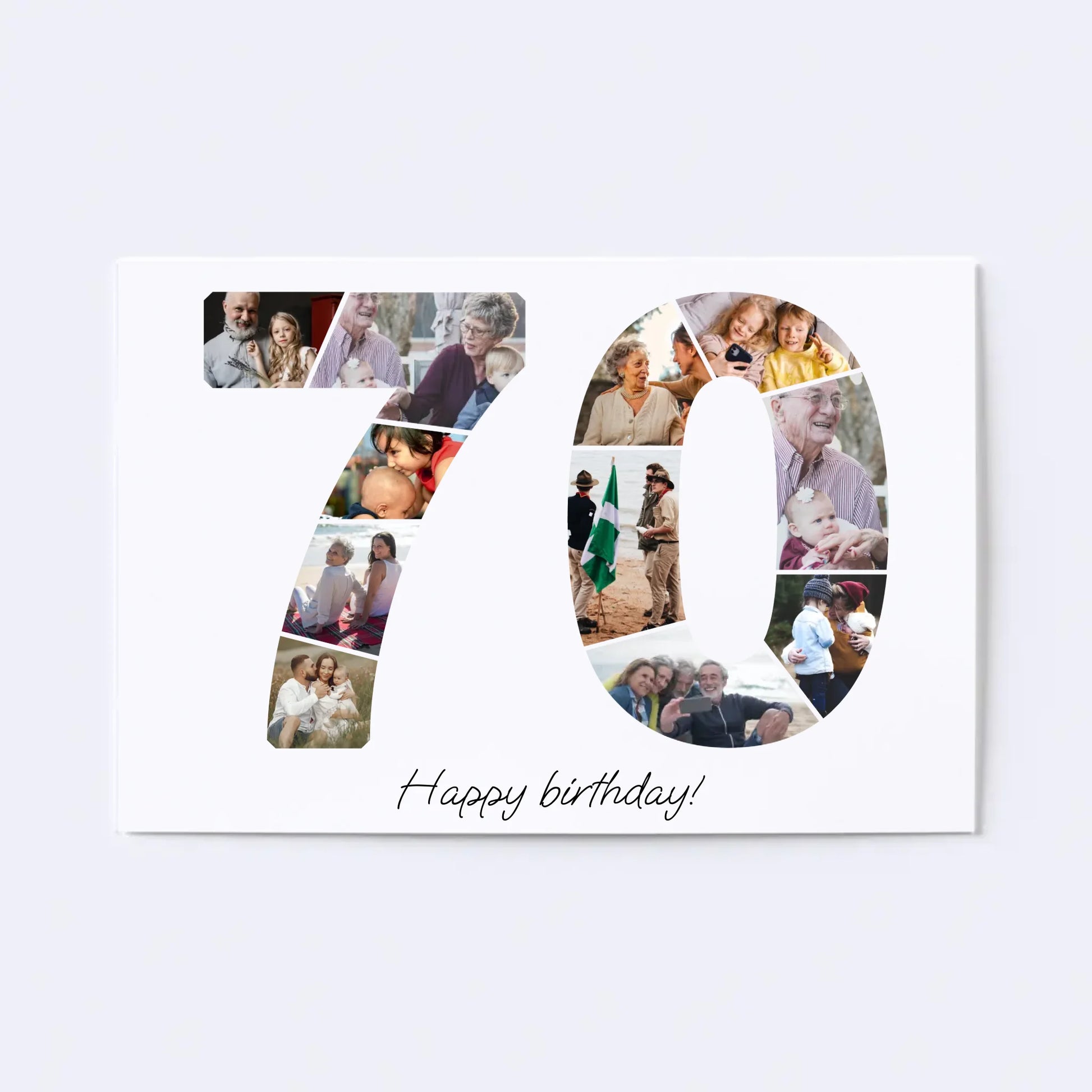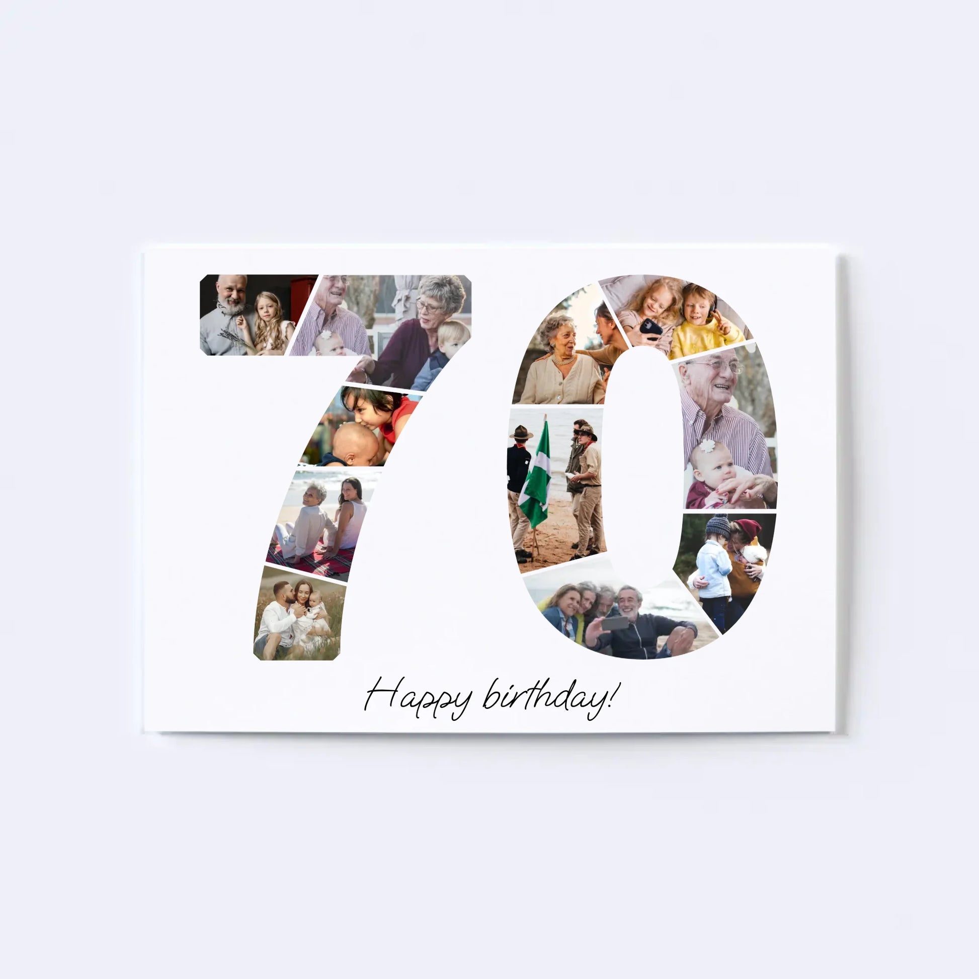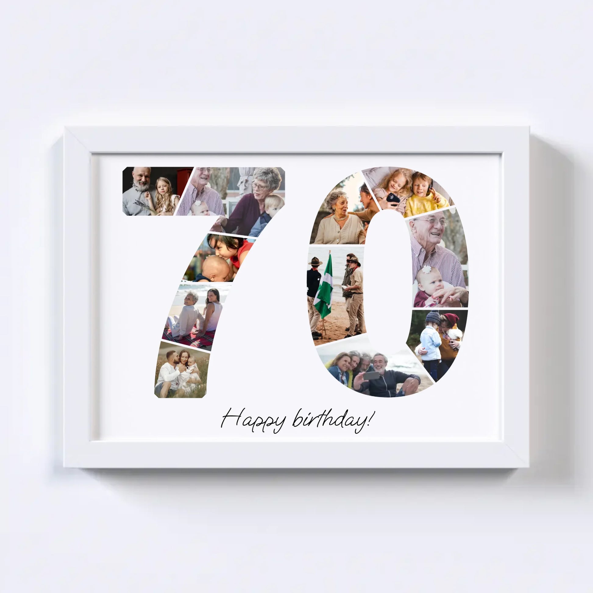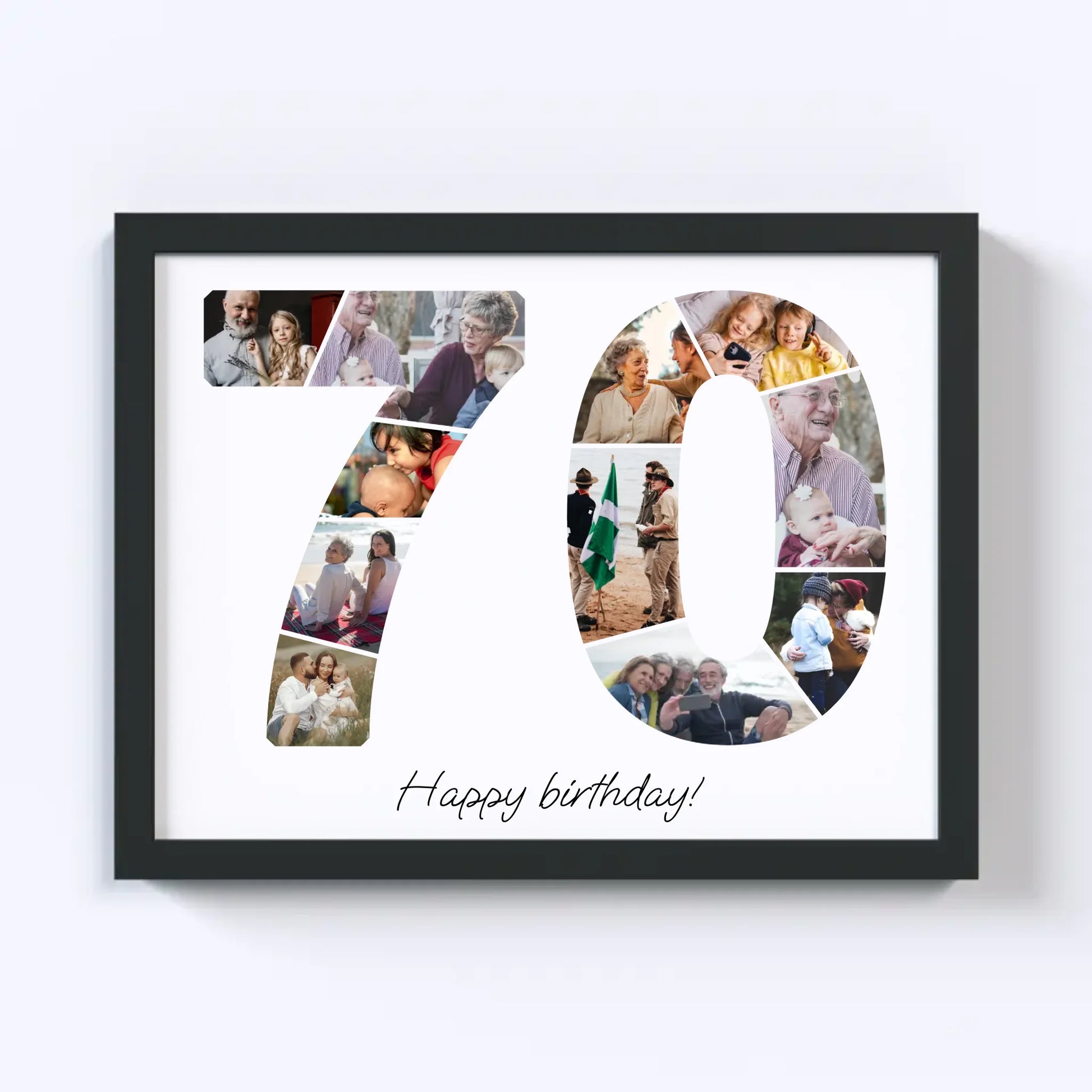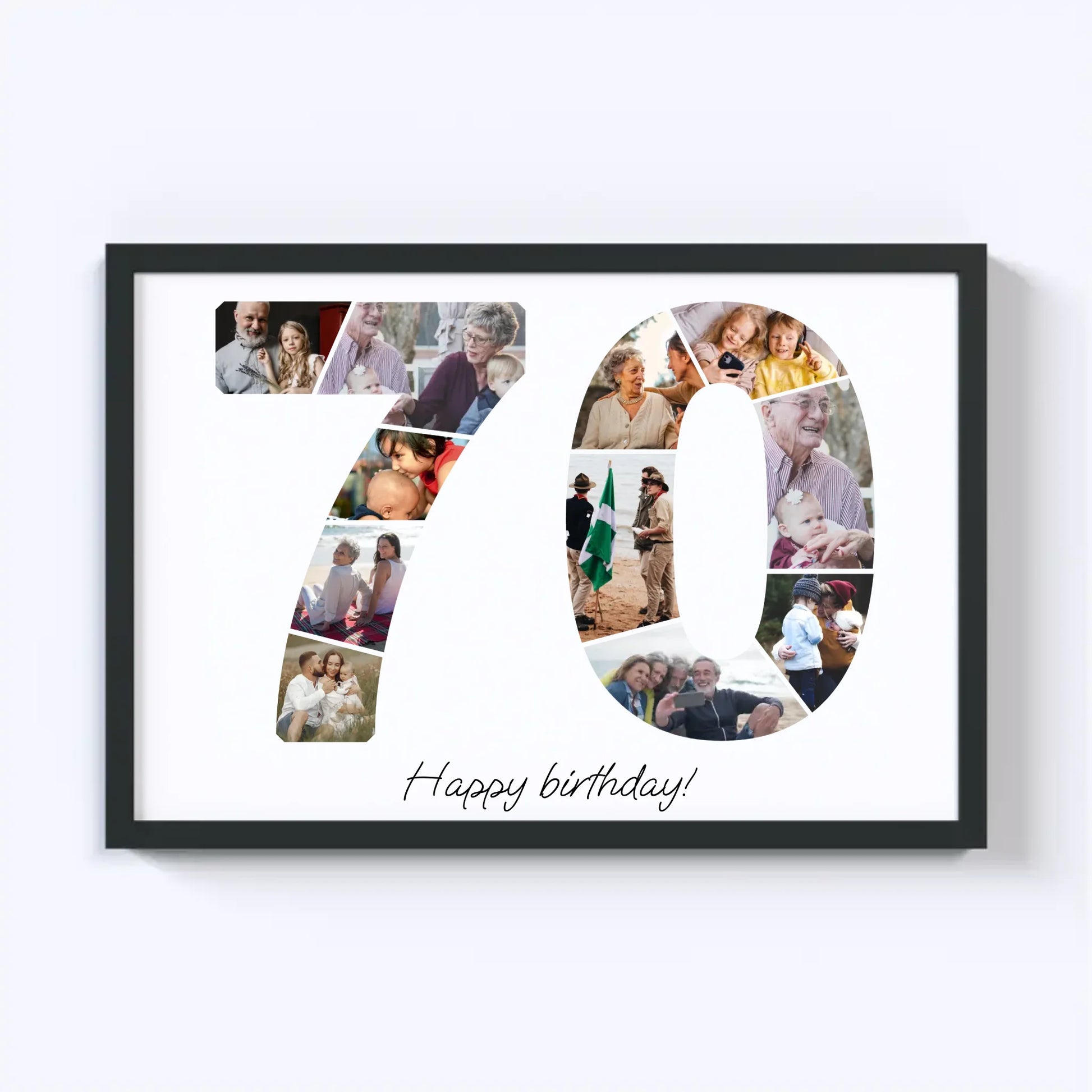 Vier zeven decennia aan herinneringen met onze aangepaste nummerfotocollage voor verjaardagen van 70 tot 79! Dit gepersonaliseerde ontwerp rangschikt uw favoriete foto's binnen de nummers van het verjaardagsjaar, en legt de speciale momenten van een leven vast. Perfect voor een 70e, 75e of elke mijlpaal daartussenin, deze collage is een oprecht cadeau of aandenken dat hun ongelooflijke reis eert. Verander gekoesterde herinneringen in een prachtig eerbetoon voor hun grote viering!