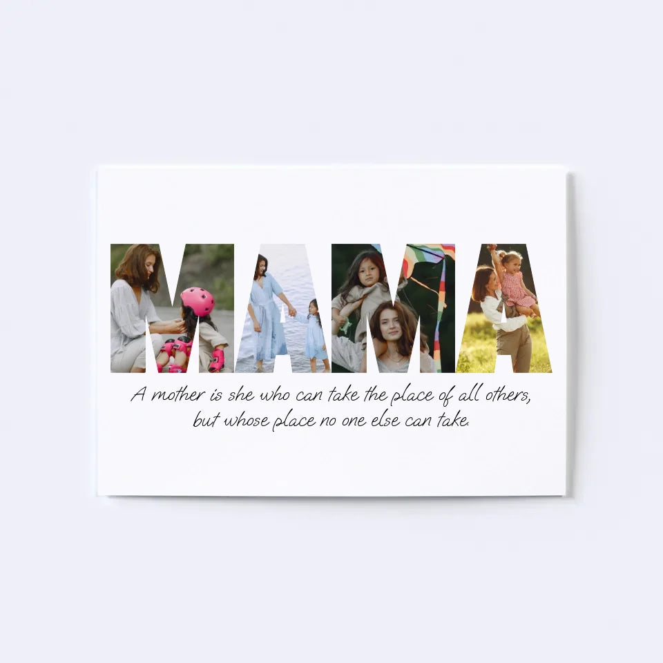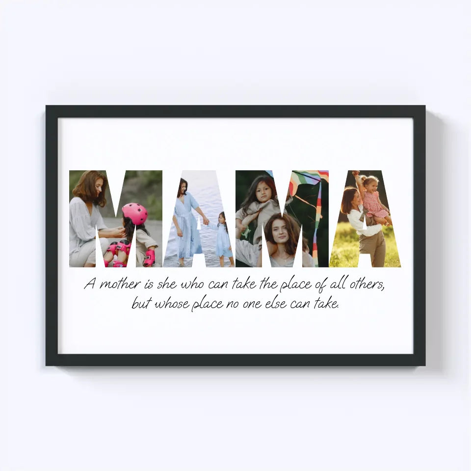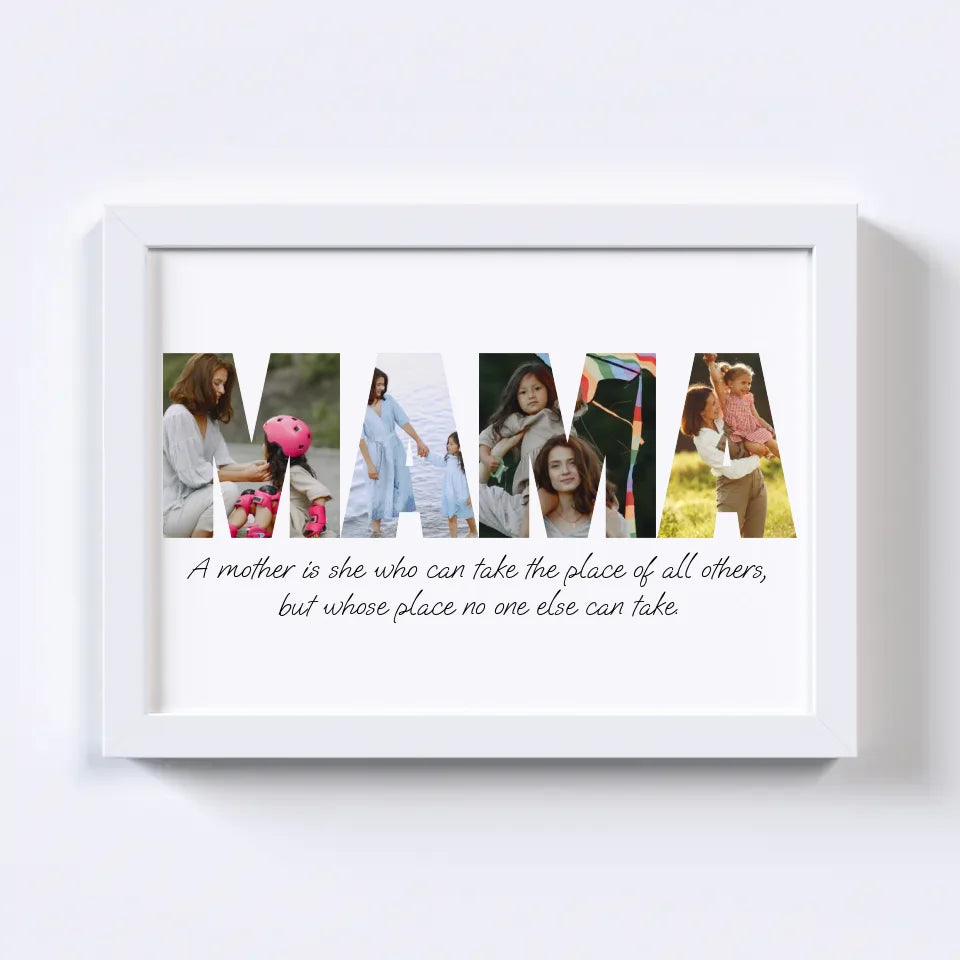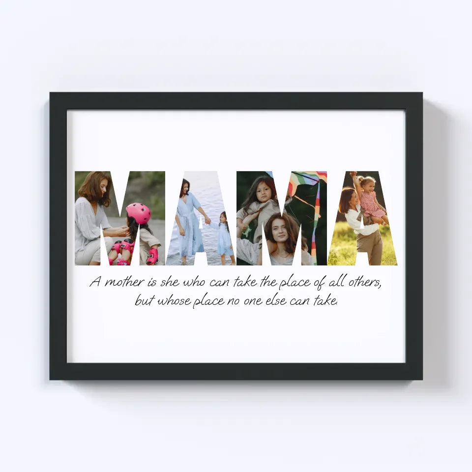 Celebrate motherhood with our custom MAMA Photo Collage! This heartwarming design spells out "MAMA" using your favorite photos, capturing cherished memories in a beautiful, personalized keepsake. Perfect as a gift for Mother's Day, birthdays, or just because, this collage turns moments of love into a unique, lasting tribute. Create a one-of-a-kind masterpiece that showcases the bond between mother and family!