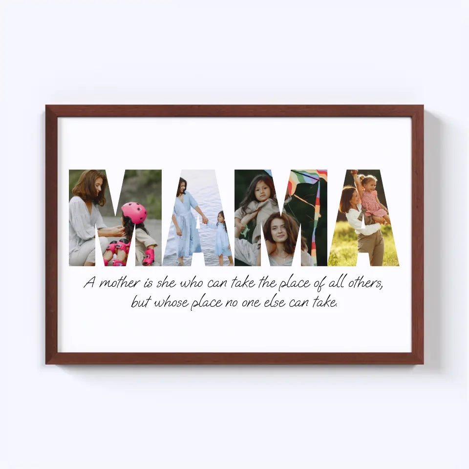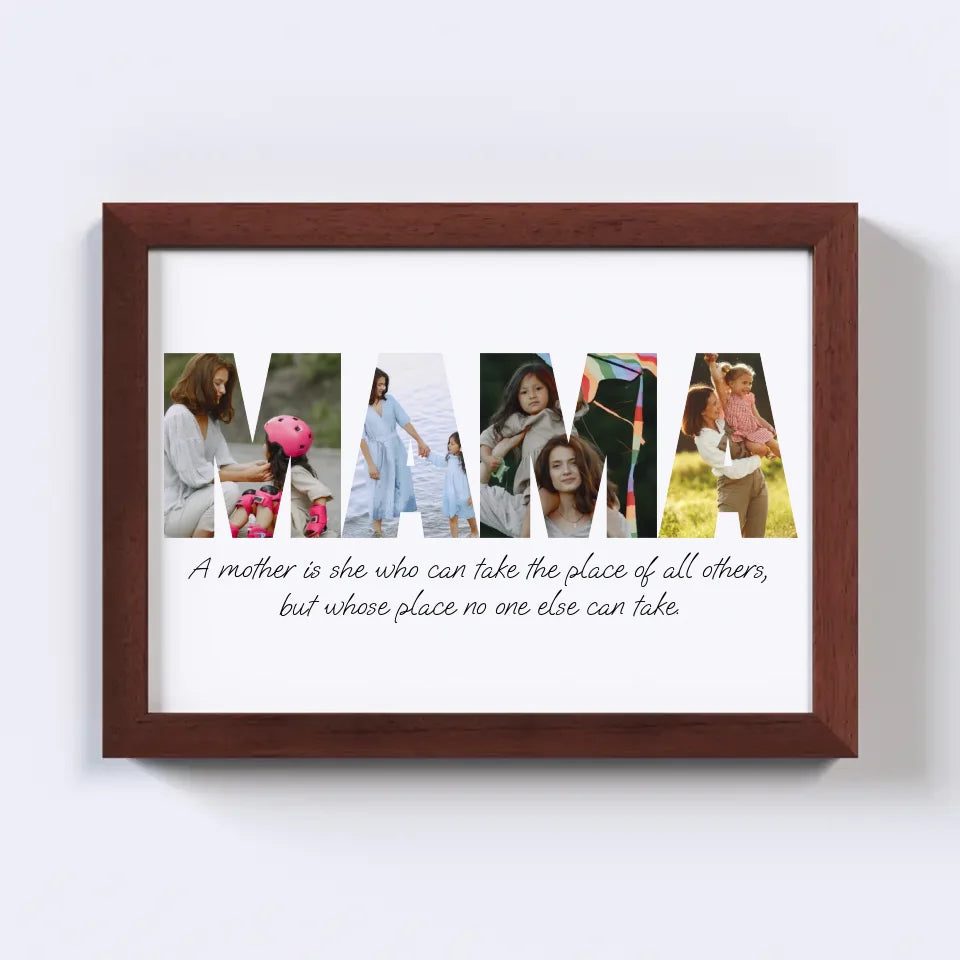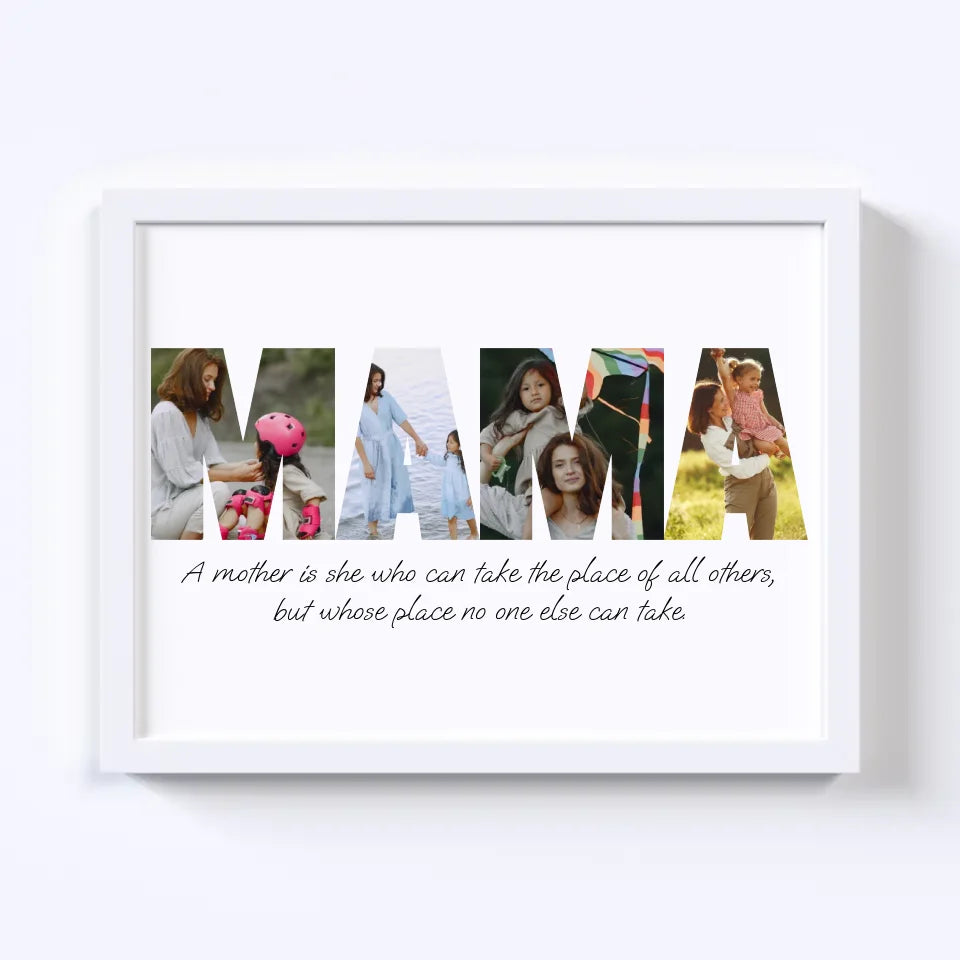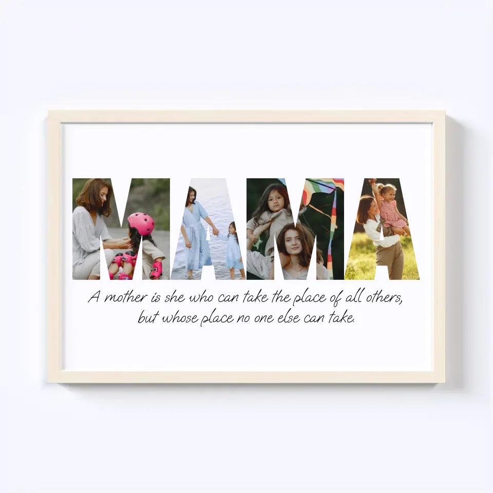 Celebrate motherhood with our custom MAMA Photo Collage! This heartwarming design spells out "MAMA" using your favorite photos, capturing cherished memories in a beautiful, personalized keepsake. Perfect as a gift for Mother's Day, birthdays, or just because, this collage turns moments of love into a unique, lasting tribute. Create a one-of-a-kind masterpiece that showcases the bond between mother and family!