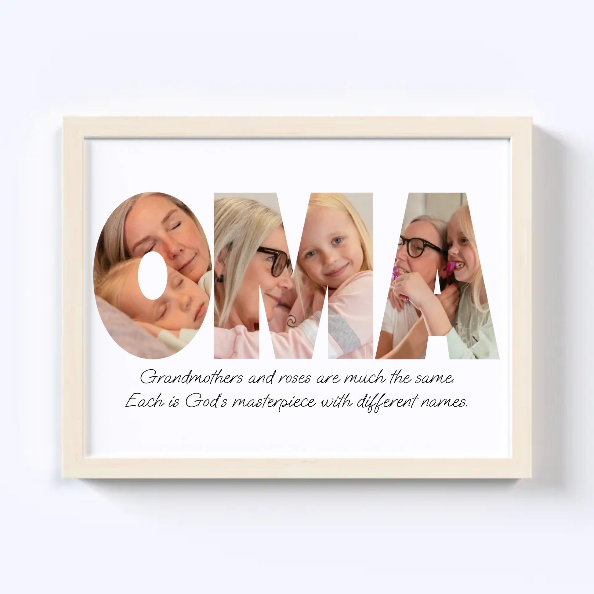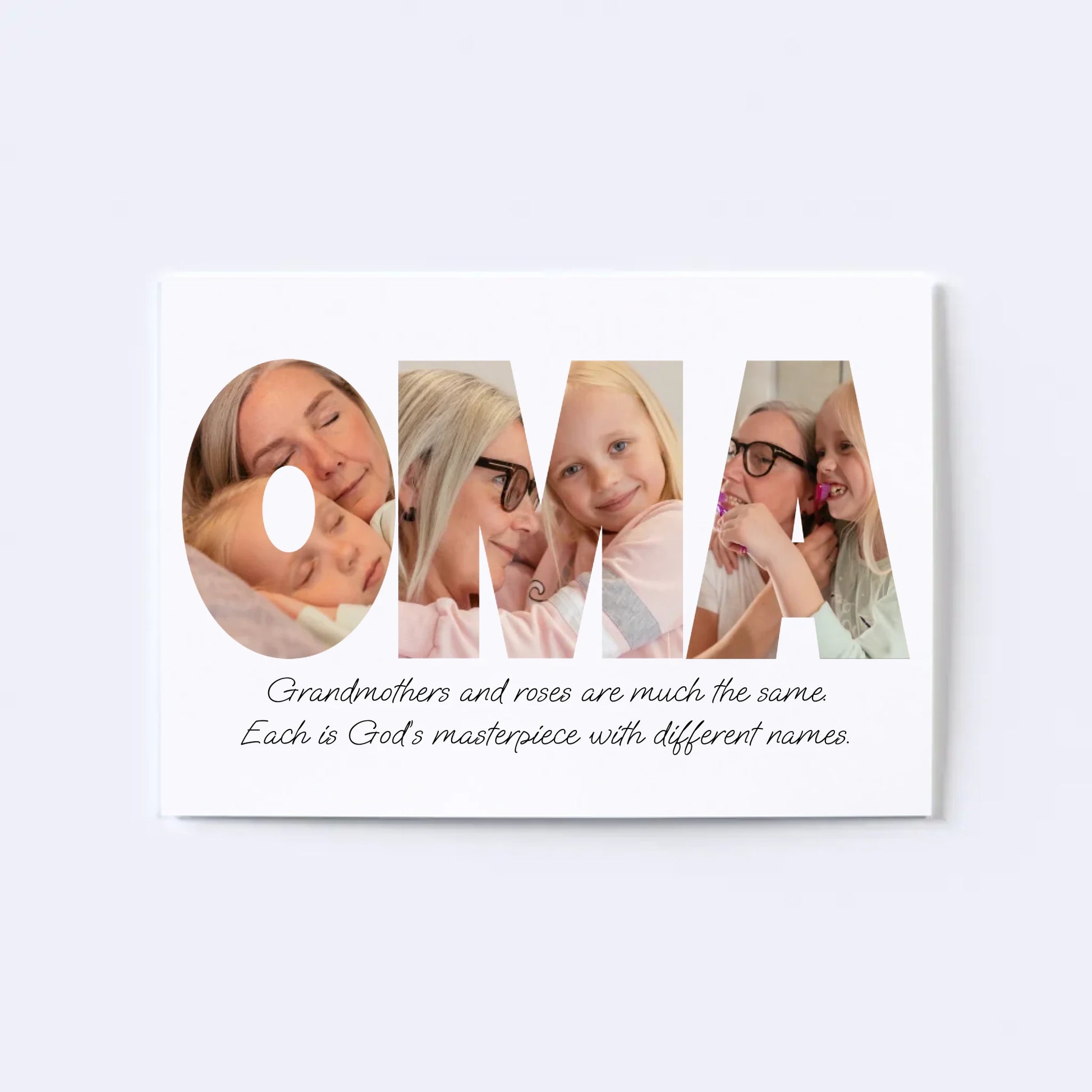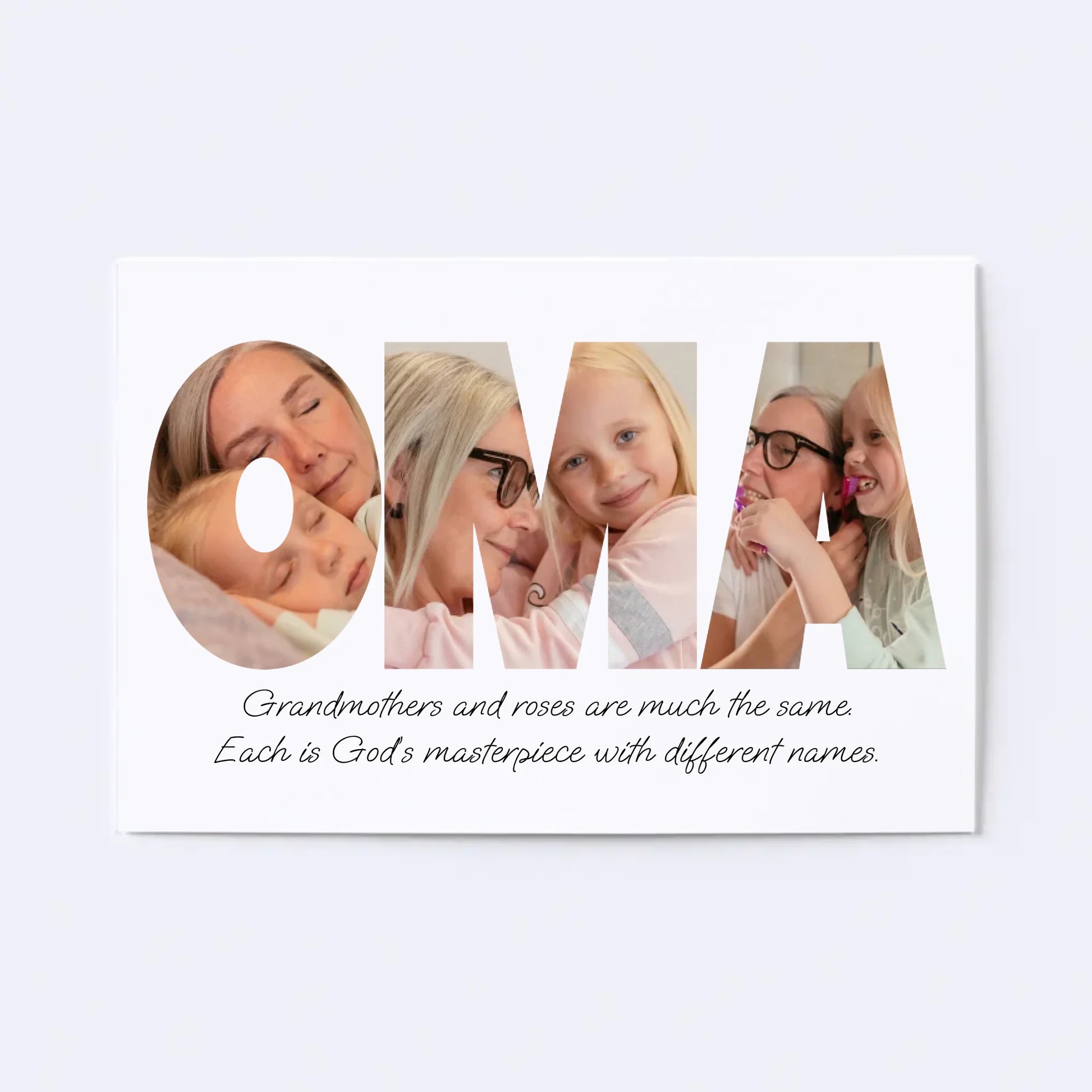 Celebrate your grandmother's love with our custom OMA Photo Collage! This personalized design spells out "OMA" using your favorite photos, capturing precious moments and memories. Perfect for birthdays, holidays, or just to show your appreciation, this unique collage is a beautiful keepsake that highlights the special bond you share with grandma. Create a lasting tribute to the heart of your family!