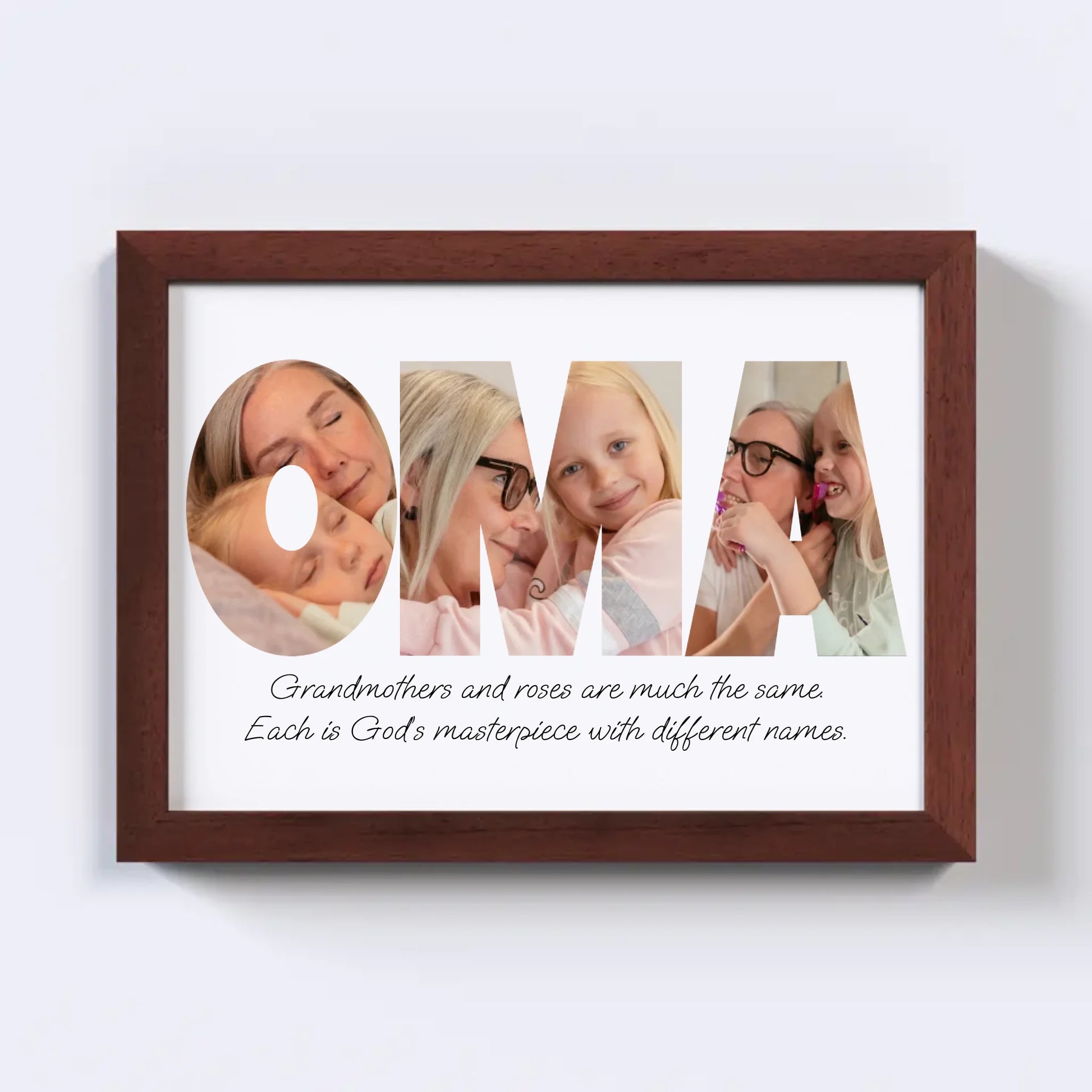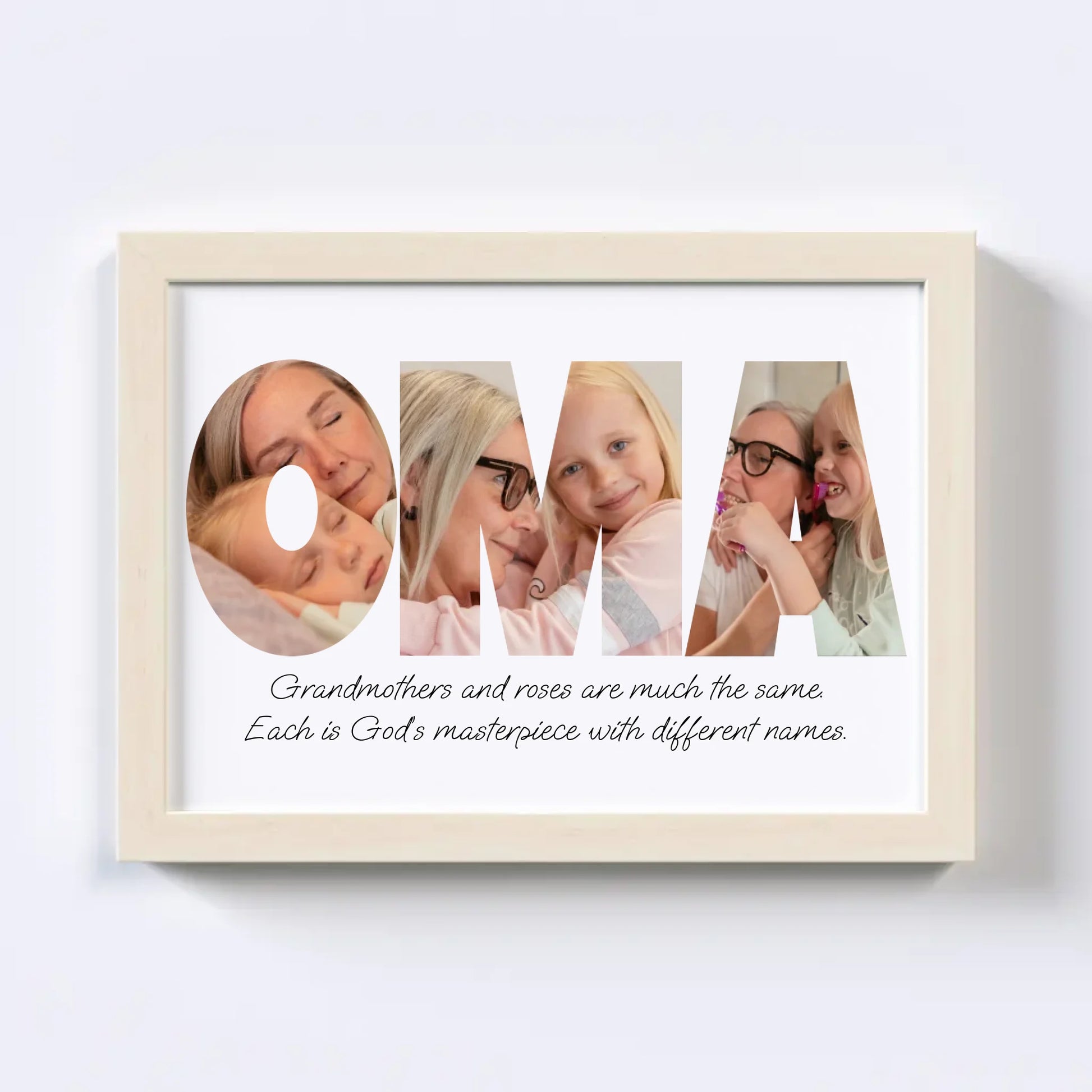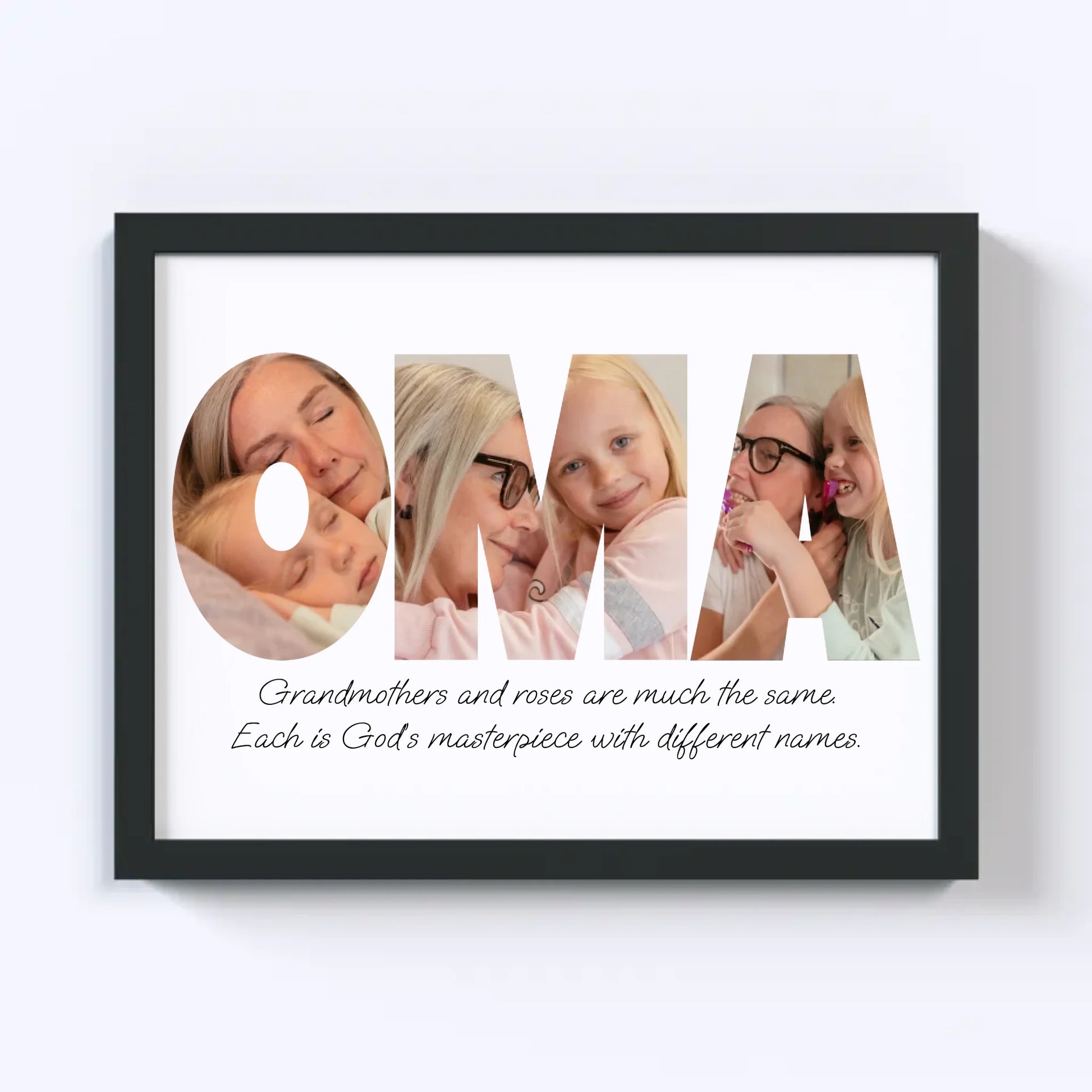 Celebrate your grandmother's love with our custom OMA Photo Collage! This personalized design spells out "OMA" using your favorite photos, capturing precious moments and memories. Perfect for birthdays, holidays, or just to show your appreciation, this unique collage is a beautiful keepsake that highlights the special bond you share with grandma. Create a lasting tribute to the heart of your family!